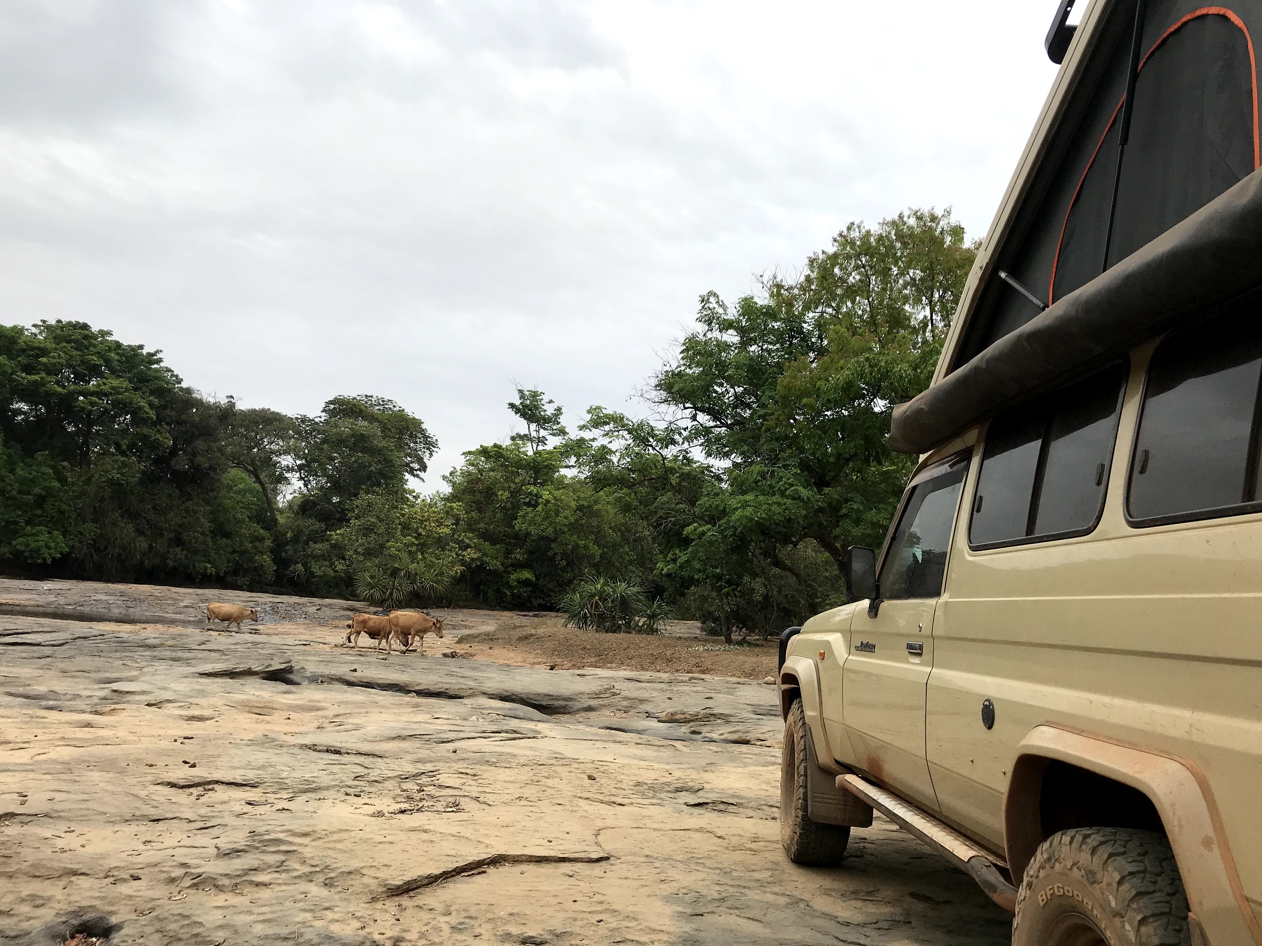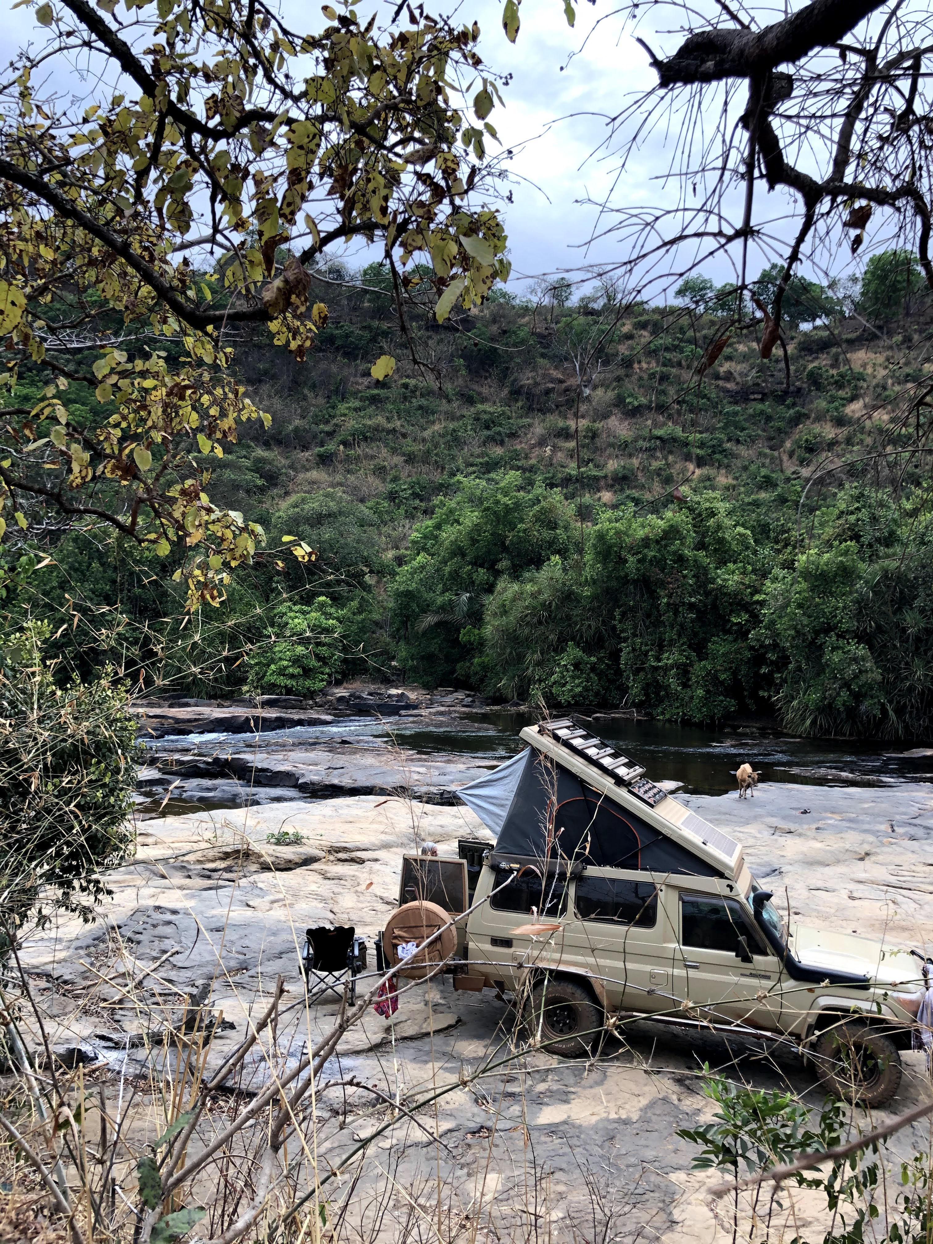 The track winds down into a ravine cloaked by riverine forest around the head of the Kambadaga waterfalls. Finally the track arrives at the edge of the river and opens up onto flat black rock surfaces above the falls. Its perfect. We drive onto the rock surface alongside the river and set up camp for the night above the falls. It’s perfect and we celebrate another perfect wild camp spot in the middle of Guinea with a swim in the river and a beer. That night we sleep with the sound of the falls in our ears. The next day rising early we take the final long day drive through Labe in northern Guinea and on to the border with Senegal. Everything works out exactly as planned as we cross Guinea with time to spare. So we decide to head to the coast of southern Senegal and spend more time on the lakes and beaches and mangrove swamps of the south.