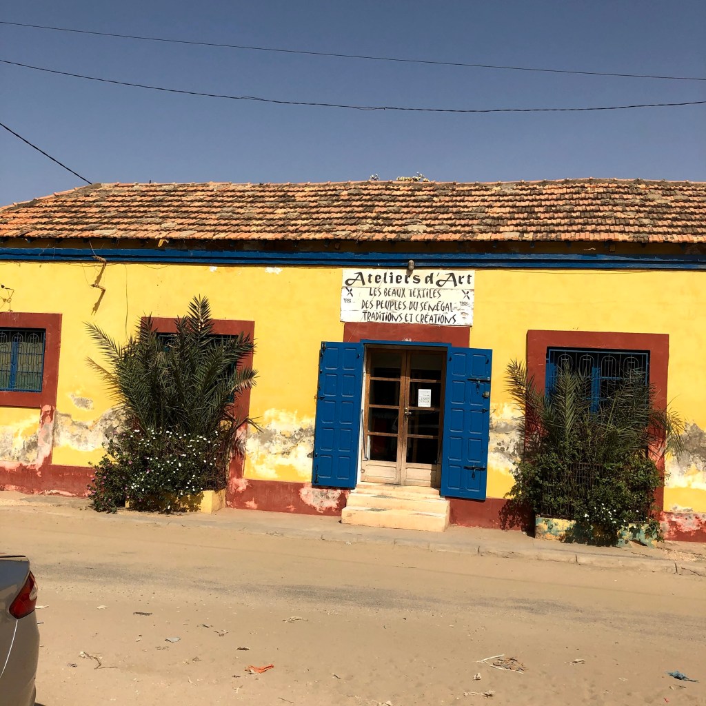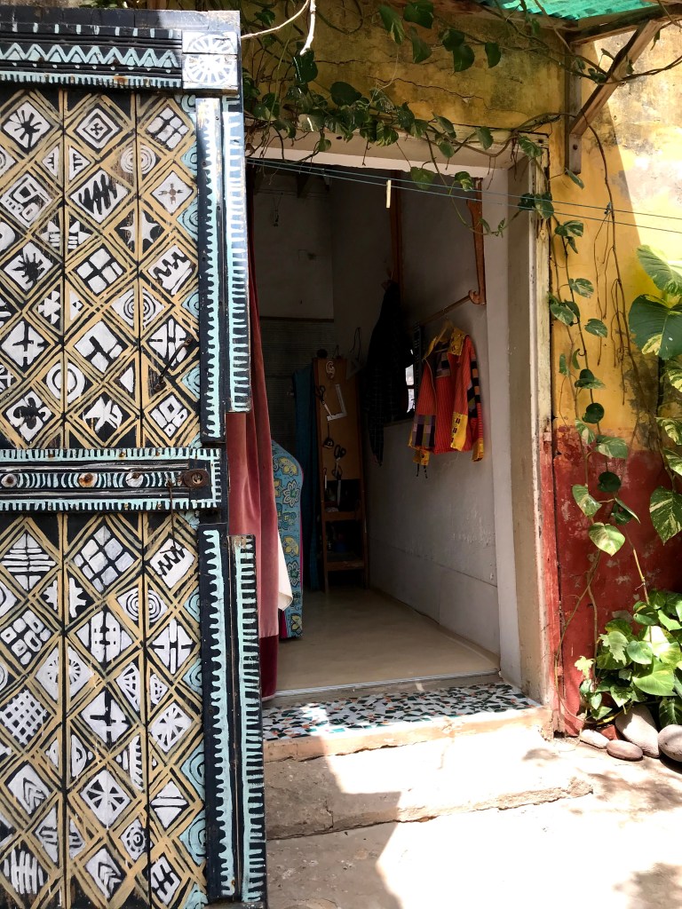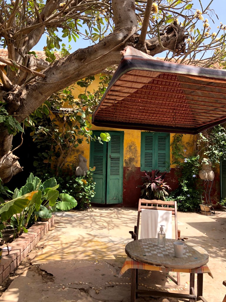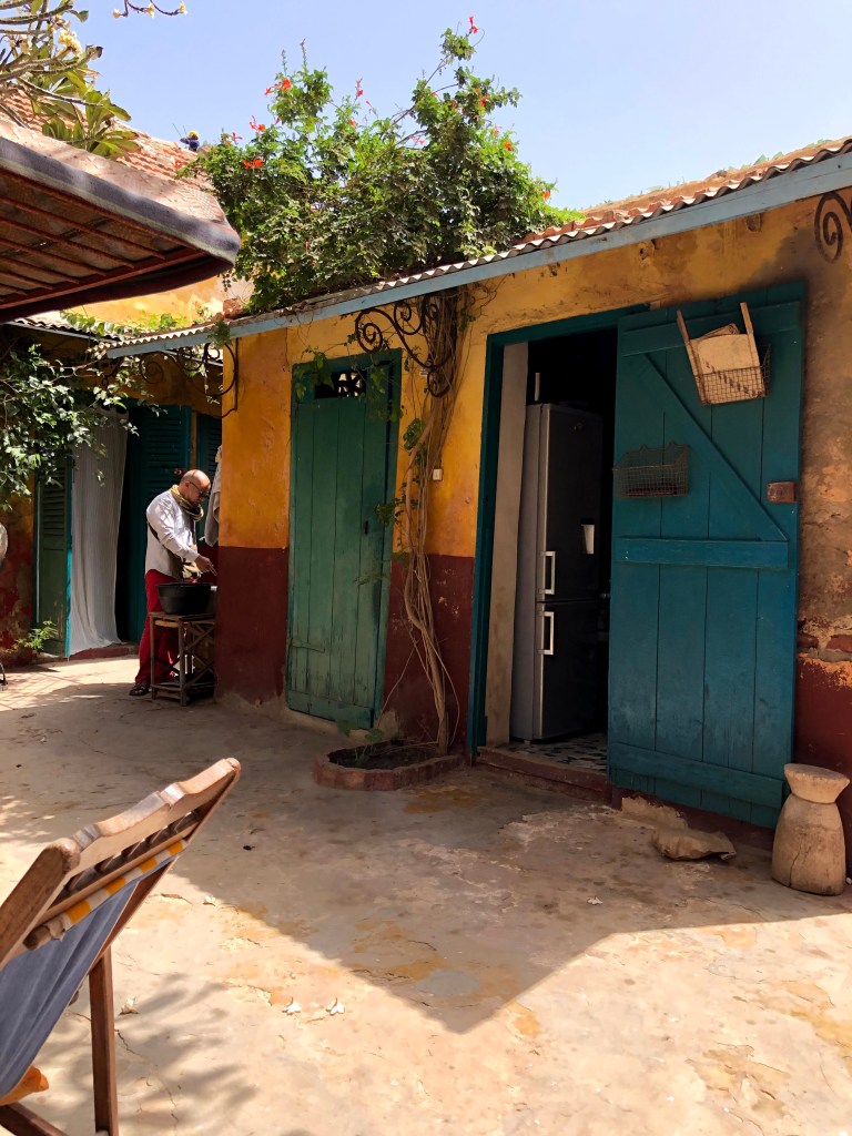 His maison is in fact an artist studio and home to his partner and her team of Senegalese weavers. She is from Paris and speaks good English and in no time she is showing us her weaving studio and our bedroom. Telling us to stay for as long as we want. āThe rent gets cheaper the longer you stay, until we are friends and then itās for freeā we hear through her broken English. They are very kind and nice. We feel an immediate affinity. Their home is picture perfect. It reminds me of Frida Karloās home in Coyoacan, Mexico City. It has those same brightly coloured green, yellow and pink walls, with a small square yard from which the rooms look at each other across the little yard.Ā Ā There is a frangipanis tree in the yard with a kitten crawling around it. The smell of open fire and freshly cooked mackerel wafts across the yard. The room we are shown is cosy comfortable. It can just fit as bed into it. No more. And has its own tiny shower and toilet area with a toilet seat! The whole casa imbues a calm, warm and inviting energy of a resolved people. Everyone and everything feels peaceful, from the owners to the quaint building layout with its well-worn gentleness.Ā