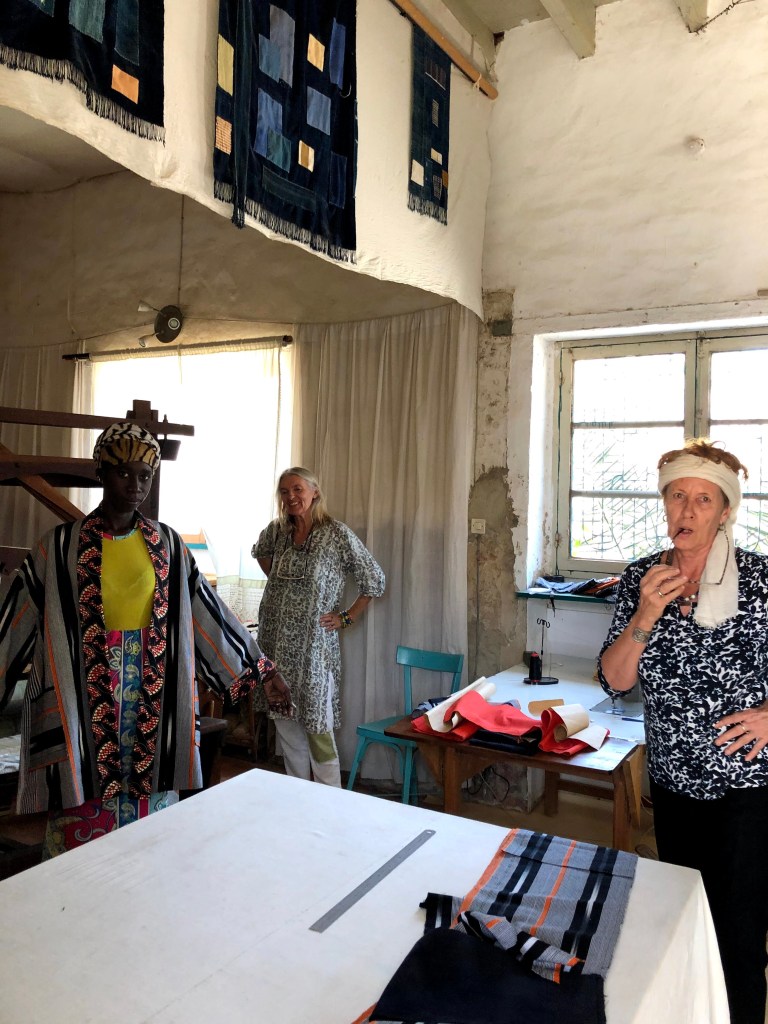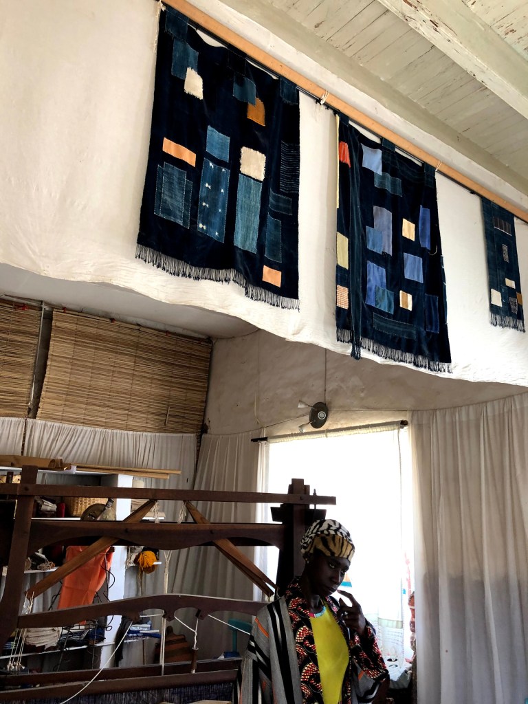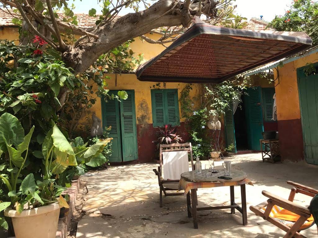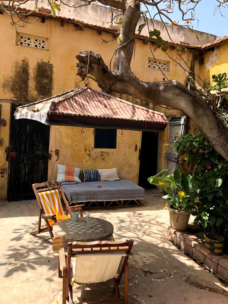 His maison is in fact an artist studio and home to his partner and her team of Senegalese weavers. She is from Paris and speaks good English and in no time she is showing us her weaving studio and our bedroom. Telling us to stay for as long as we want. āThe rent gets cheaper the longer you stay, until we are friends and then itās for freeā we hear through her broken English. They are very kind and nice. We feel an immediate affinity. Their home is picture perfect. It reminds me of Frida Karloās home in Coyoacan, Mexico City. It has those same brightly coloured green, yellow and pink walls, with a small square yard from which the rooms look at each other across the little yard.Ā Ā There is a frangipanis tree in the yard with a kitten crawling around it. The smell of open fire and freshly cooked mackerel wafts across the yard. The room we are shown is cosy comfortable. It can just fit as bed into it. No more. And has its own tiny shower and toilet area with a toilet seat! The whole casa imbues a calm, warm and inviting energy of a resolved people. Everyone and everything feels peaceful, from the owners to the quaint building layout with its well-worn gentleness.Ā