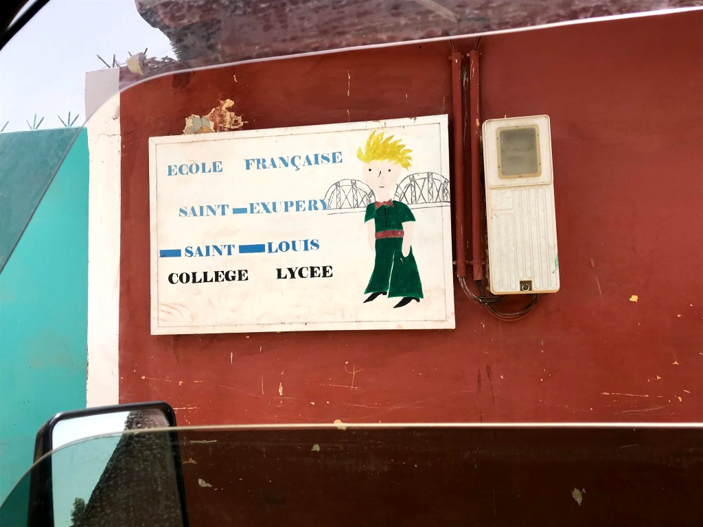 We roll into the fishing village type town of Saint Louis. Itās built on an estuary and it’s bustling with fishermen in their dhows and a local life of street trading. The old town sits on the peninsula which is linked to the mainland city area by a huge cast steel bridge, built by Eiffel of the Eiffel tower fame. The bridge links the old and the new and itās simply stunning. Maybe itās our semi shell shocked condition, but everything looks quaintly illuminated. It shines with warmth and tranquillity. It feels to our foreign eyes like its works with a certain harmony one associates with beehive activity. Itās got that quaint vibe of old French town elegance that comes with its french architecture, narrow and cobbled streets, brightly coloured bougainvilleaās falling over ancient, cracked walls.Ā Ā Artists, food peddlers and tradesmen are selling their wares alongside every street of the old town. And there are frescos on the walls of buildings with childlike drawings of scenes from āThe Little Princeā with Antoine de Saint-ExupĆ©ryĀ Ā name inscribed in honour of his story and the pictures.Ā This is the town: