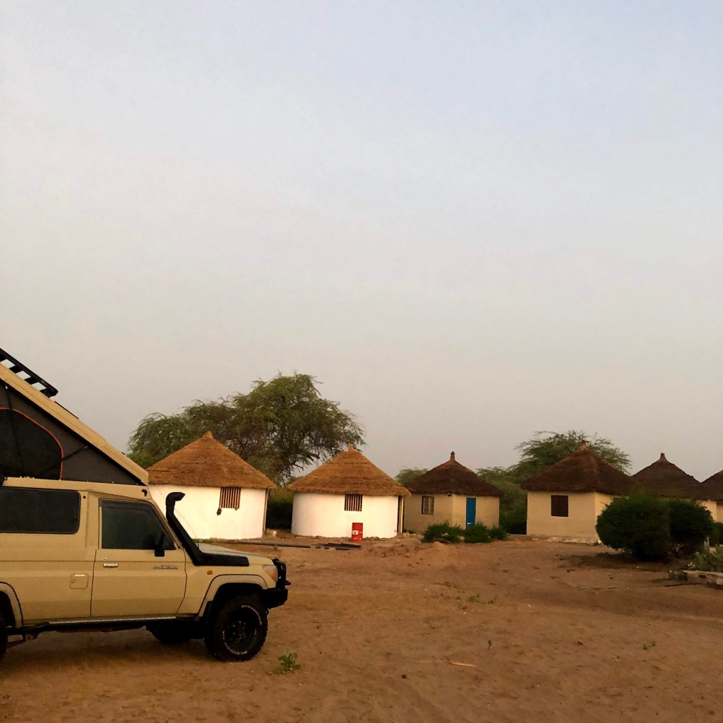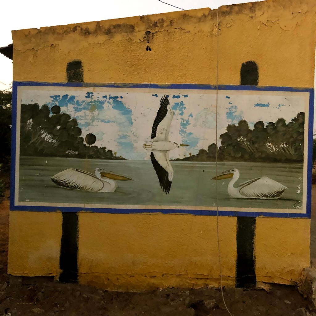 We search and find a village alongside the wetland. It has a diagram of pelicans and herons drawn into the wall of the huts. Some birders have been here before. Good sign. We approach the patron as dusk sets in and ask about the park and whether we can camp here. He speaks French only and ours is just a bunch of broken phrases as presented by google translate. But its enough. Enough to get what he is saying. And he is saying the park closed today because of the virus. We are welcome to stay but we cannot enter the park. Not tomorrow or at any time for the foreseeable future.Ā