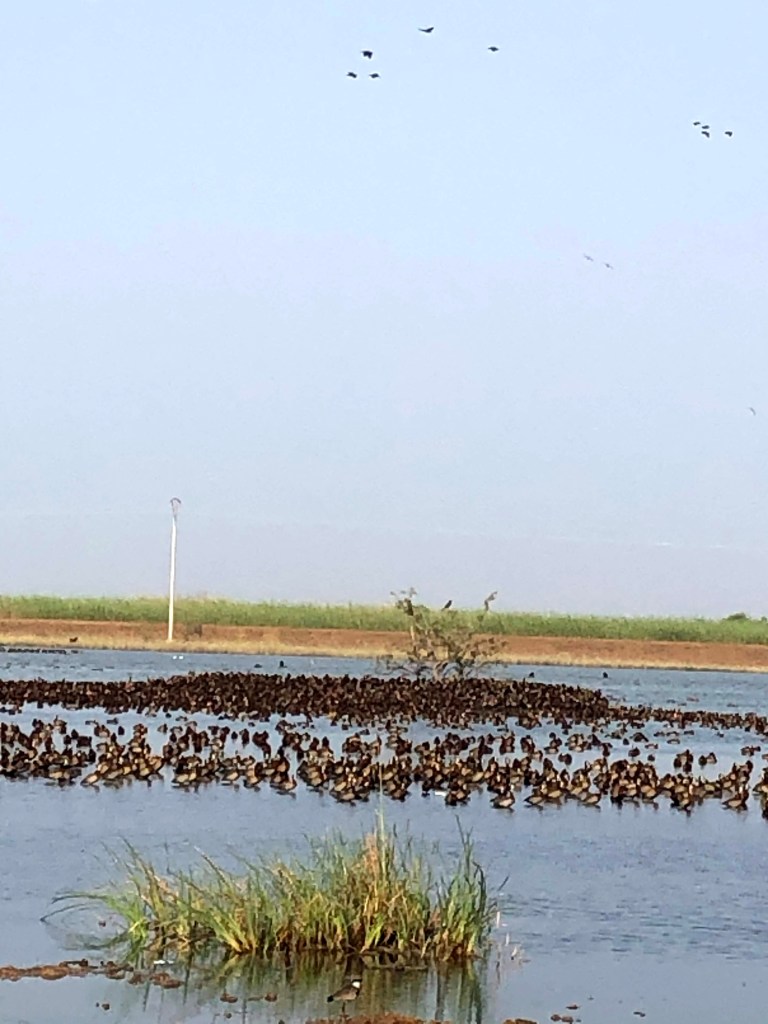 Here we are at our campsite alongside Djoudji National Bird Sanctuary with its flocks of white faced duck: